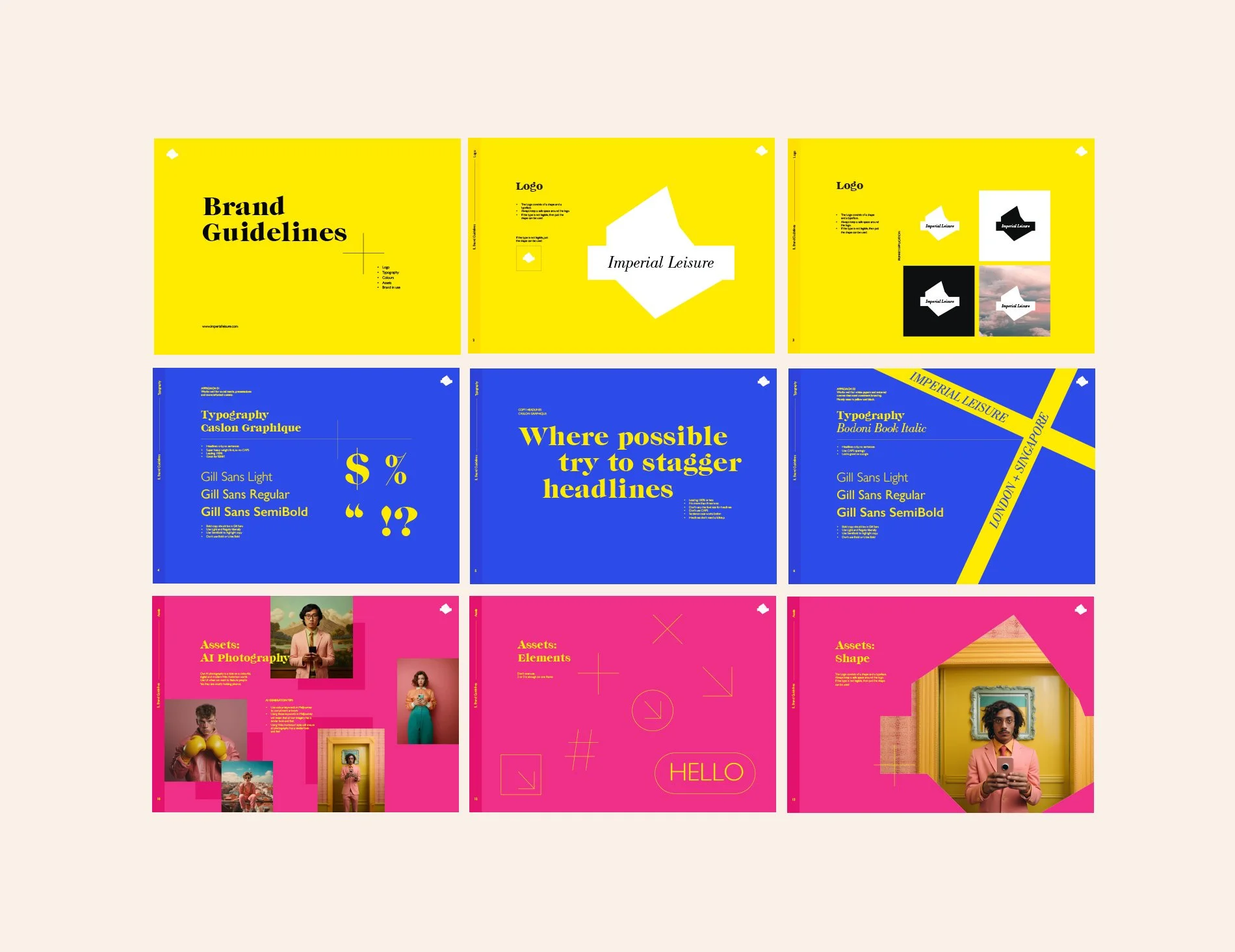 Expanding and formalising the branding for the creative agency Imperial Leisure, including brand guidelines, AI photography standards, social content, brand pillars, and pitch decks.